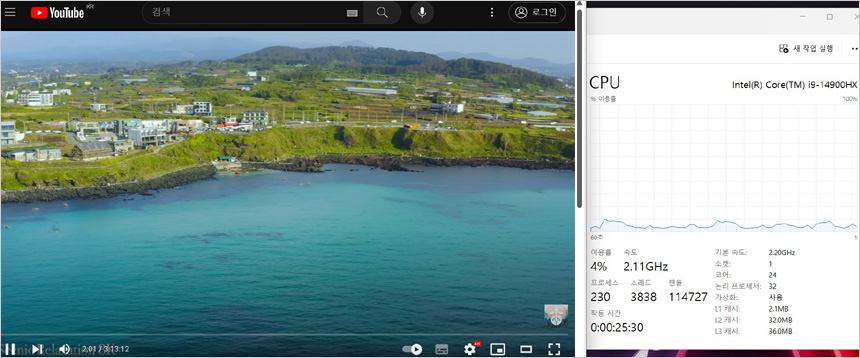 유튜브 고화질 동영상을 이용해 CPU 점유율을 테스트 하고 있는 모습으로 (2160P@60FPS) 3-7% 대의 점유율을 보여 주었으며 인터넷을 실행했을 때 20% 초반까지 점유율이 올라가는 것을 확인할 수 있었다.