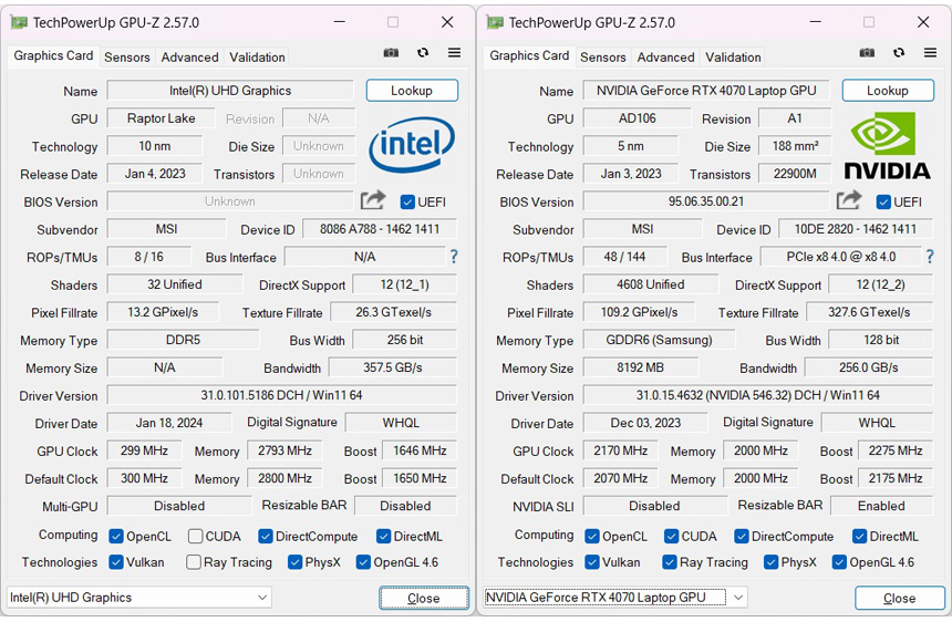 내/외장 그래픽의 스펙을 확인하고 있는 모습으로 RTX 4070 은 2275MHz 부스트 클럭으로 작동하며 8GB 의 비디오 전용램이 제공되는 것을 확인할 수 있다.