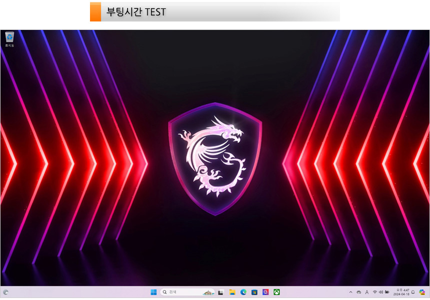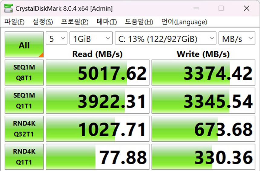 저장장치의 속도를 확인하고 있는 모습으로 PCIe Gen4 SSD가 기본 장착되어 5000MB/s 이상의 빠른 읽기 속도를 지원하는 것을 확인할 수 있다. 1TB 용량을 지원하고 여분의 슬롯을 제공해 대용량 데이터를 손쉽게 저장할 수 있고 최신 게임을 여유롭게 설치해 플레이 할 수 있다.