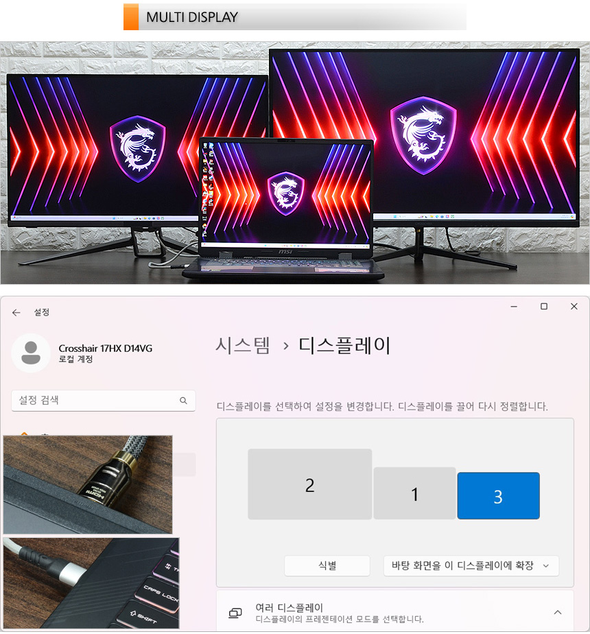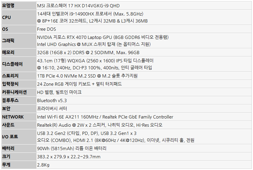 이번에 리뷰를 진행 할 MSI 크로스헤어 17 HX D14VGKG-i9 QHD 최신 게임을 최상위 옵션에서 부드럽게 즐길 수 있는 최고급형 게이밍 노트북으로 14세대 인텔코어 i9-14900HX 프로세서와 RTX 4070 랩탑 GPU, 32GB DDR5 듀얼채널 메모리 탑재로 보급형 게이밍 노트북을 압도하는 강력한 성능을 경험할 수 있다. 특히 1TB 대용량 PCIe 4.0 NVMe SSD가 기본 장착되어 있어 대용량 최신 게임도 여유롭게 설치해 즐길 수 있으며 MUX 스위치가 탑재되어 더 강력한 성능으로 게임을 즐길 수 있다.