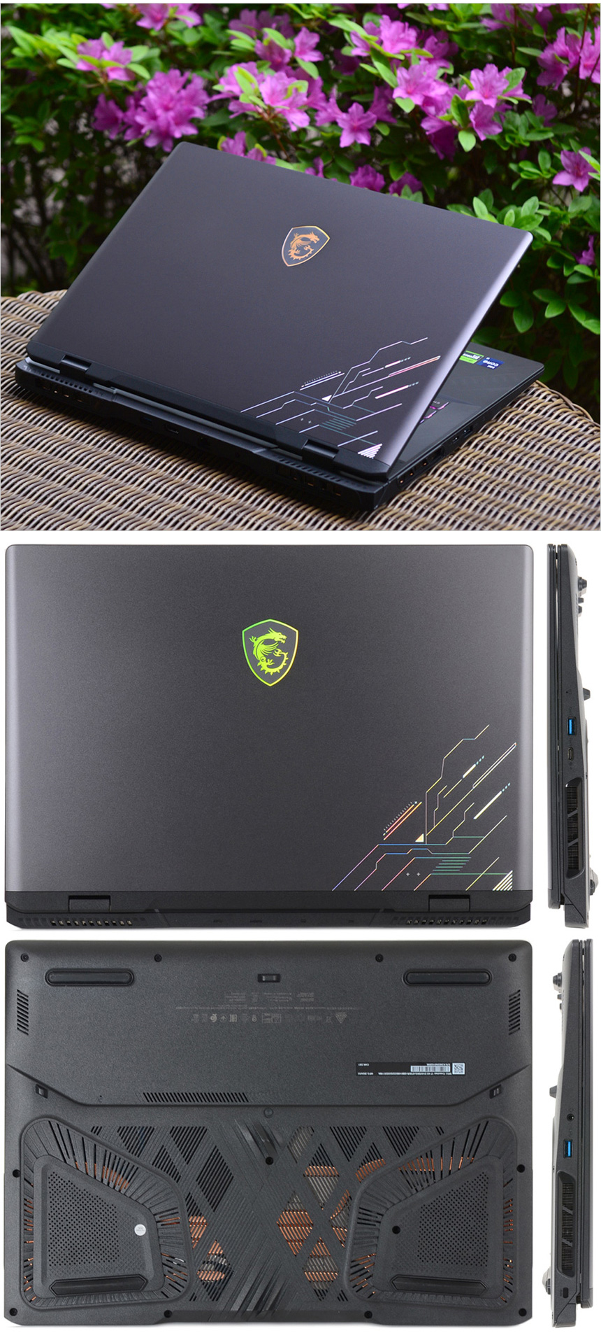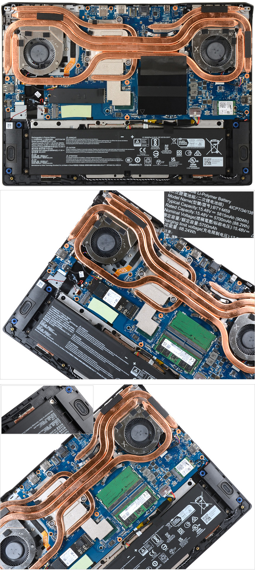바닥면 내부의 모습으로 2개의 팬과 5개의 히트파이프, 6개의 통풍구로 구성된 쿨러부스트5를 지원해 열을 빠르게 식혀주고 뜨거워진 공기는 빠르게 외부로 방출한다. (팬이 최대 속도로 동작해 빠르게 열을 식힐 수 있는 쿨러부스트 기능을 단축키로 제공한다.) 또한 하단에는 5815mAh 용량의 리튬이온 배터리가 설치되어 있고 스피커가 장착되어 있다.