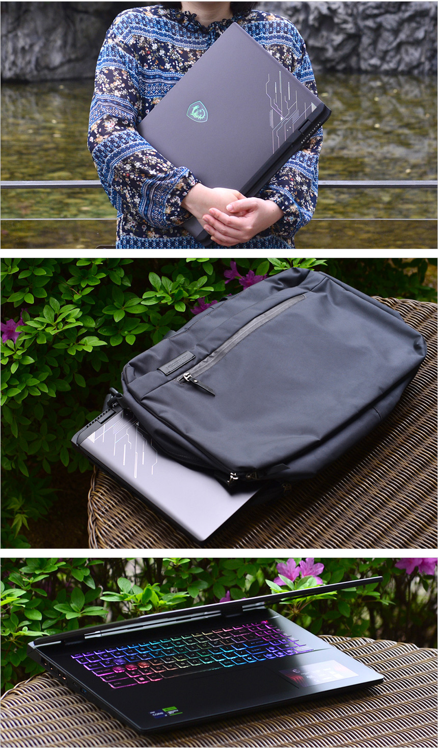 17형 대화면을 지원하는 고성능 노트북으로 크기도 크고 다양한 부품을 사용하다 보니 두께도 상당한 것을 확인할 수 있다. 이런 이유로 항상 들고다녀야 하는 유저들에게는 적합하지 않다. 단, 전용 가방을 제공하며 대용량 배터리, PD충전 지원으로 들고 다니며 외부에서 사용하는데 큰 불편은 느껴지지 않았다. (필자는 촬영 때문에 며칠 가지고 다녔는데 부담스럽다는 느낌은 없었다.)