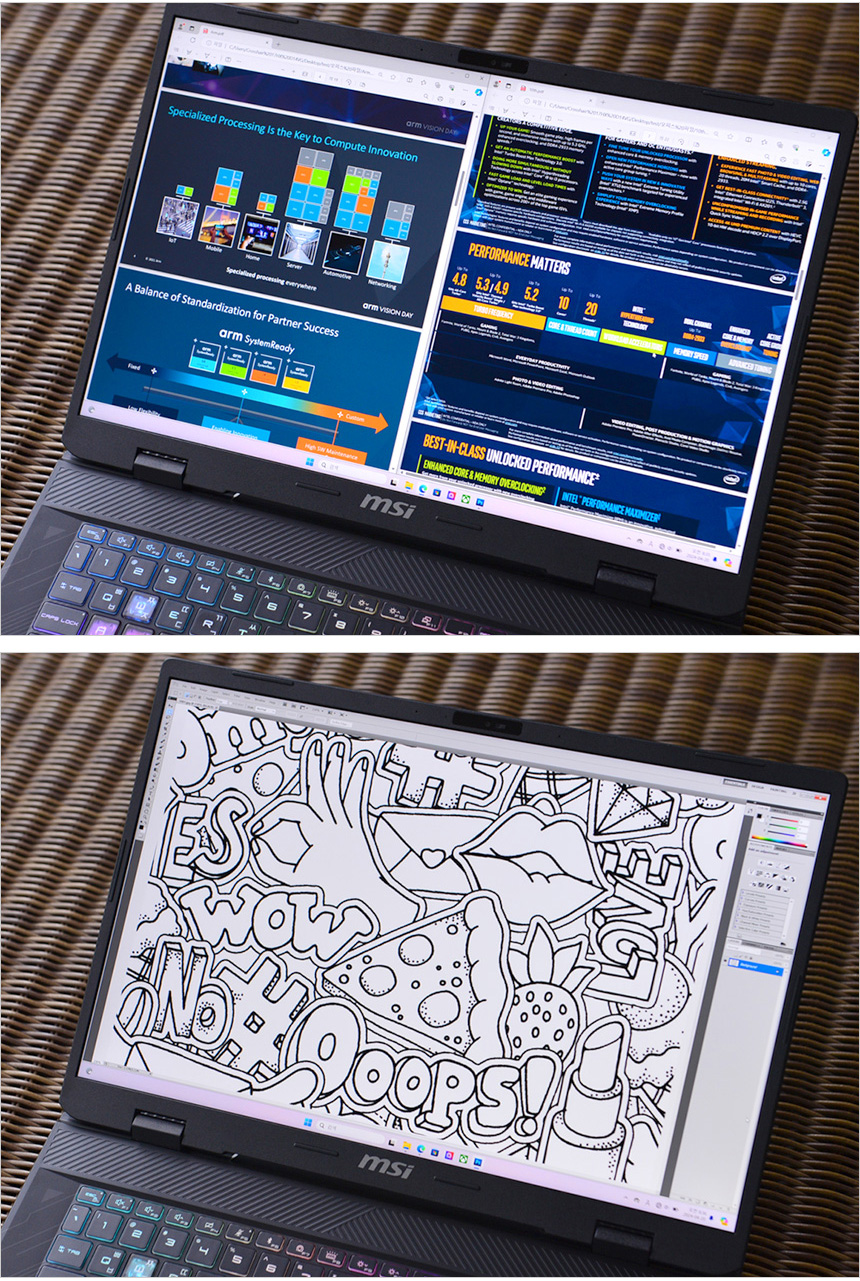 최고급형 게이밍 노트북에 걸맞는 디스플레이 탑재도 장점이라 할 수 있다. 240Hz 주사율을 지원해 일반 유저들 뿐만 아니라 작은 차이도 확연하게 확인할 수 있는 프로나 준프로 게이머 들도 편하게 게임을 즐길 수 있으며 17형 대화면으로 시원시원한 영상을 즐길 수 있다. 또한 WQXGA 고해상도로 한차원 높은 디테일을 경험할 수 있었으며 16:10 비율을 적용해 웹서핑이나 각종 작업이 상당히 편했다.