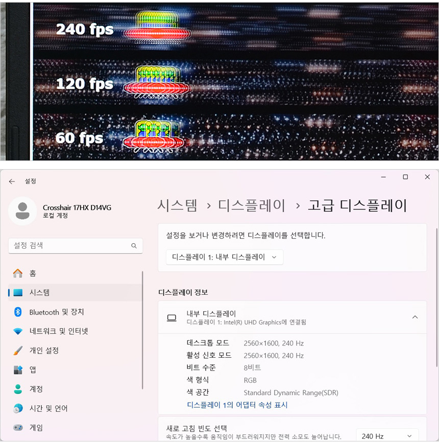 120Hz 나 144Hz 주사율을 지원하는 일반 게이밍 노트북과 달리 240Hz 주사율 지원으로 더 부드러운 영상을 즐길 수 있다. 상단의 사진은 하위 프레임과 같이 재생되는 영상 (960 Pixel Per Sec) 을 셔터스피드 1/20 로 촬영한 모습으로 프레임이 낮을수록 캐릭터의 수가 적으며 프레임이 높아질수록 시간당 많은 화면이 뿌려지기 때문에 캐릭터의 수가 많은 것을 확인할 수 있다.