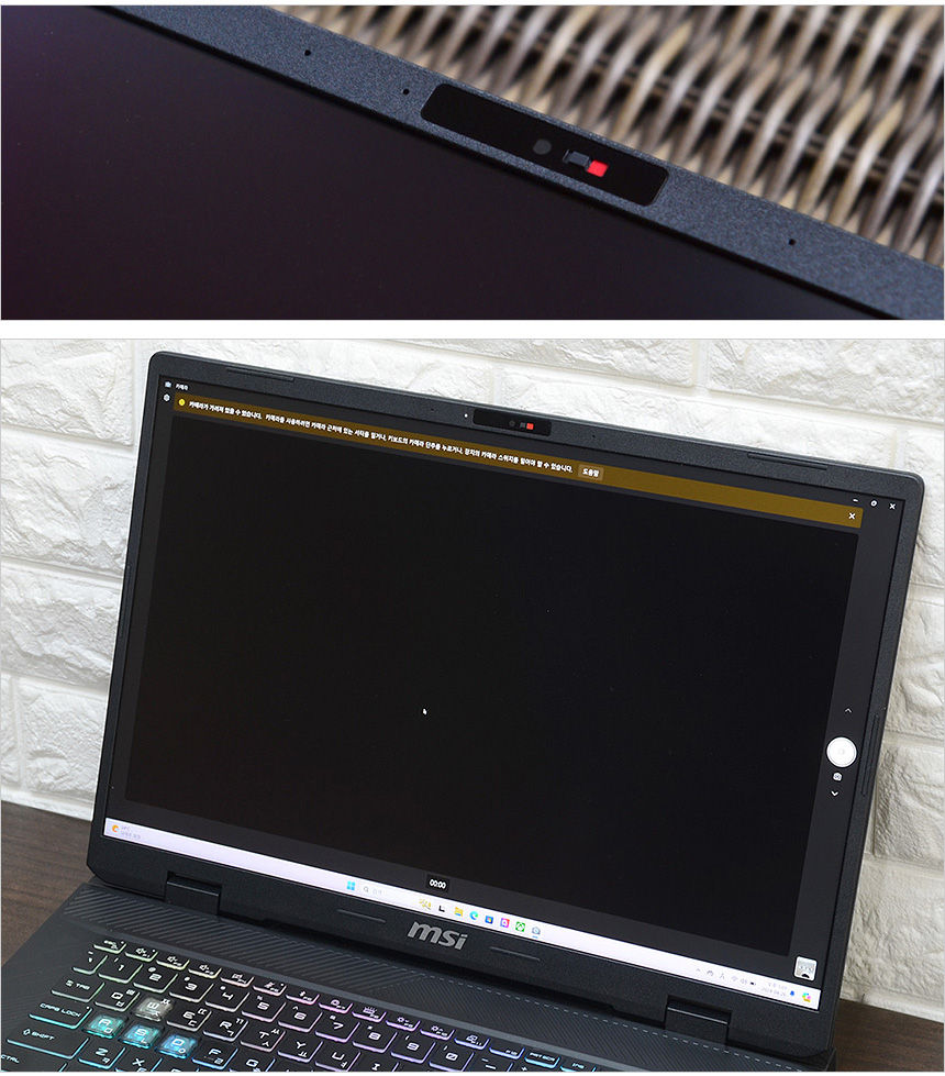웹캠을 이용한 비주얼 해킹이나 사생활 침해를 원천적으로 차단할 수 있도록 카메라에 프라이버시 셔터가 장착된 것을 확인할 수 있다. 물리적으로 카메라를 가려주기 때문에 해킹으로 노트북 권한을 획득 하더라도 사용자나 주변 상황을 전혀 볼수 없다. (동영상을 통해 자세히 확인하기 바란다.)