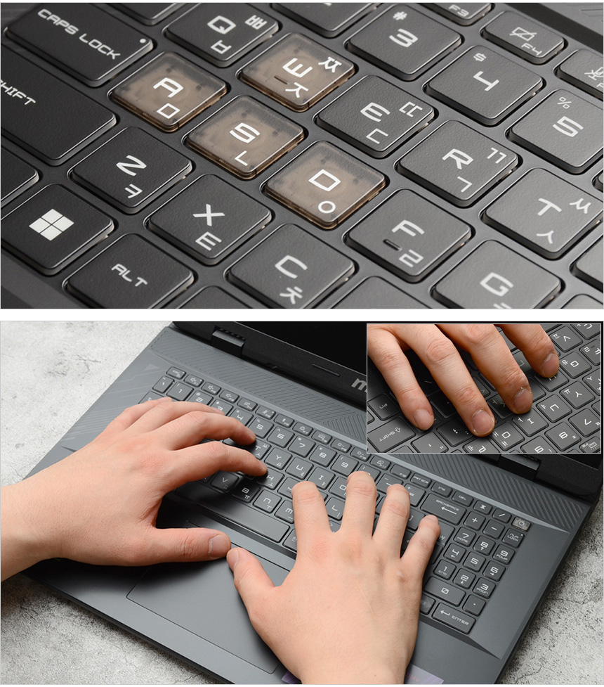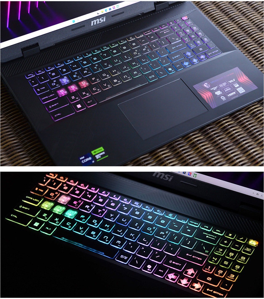 키보드의 모습으로 17형 대화면을 지원 노트북 답게 텐키가 포함된 풀사이즈 키보드가 장착되어 있다. 특히 키캡 테두리 부분까지 조명이 적용되어 확연한 구분감을 제공하며 단색의 백라이트를 지원하던 전작과 달리 24존 RGB 백라이트를 지원해 아름다운 조명 효과를 즐길 수 있었다. 또한 게이밍 노트북 답게 방향키와 WASD 키캡에 포인트를 주어 구분감을 높인것도 마음에 든다.