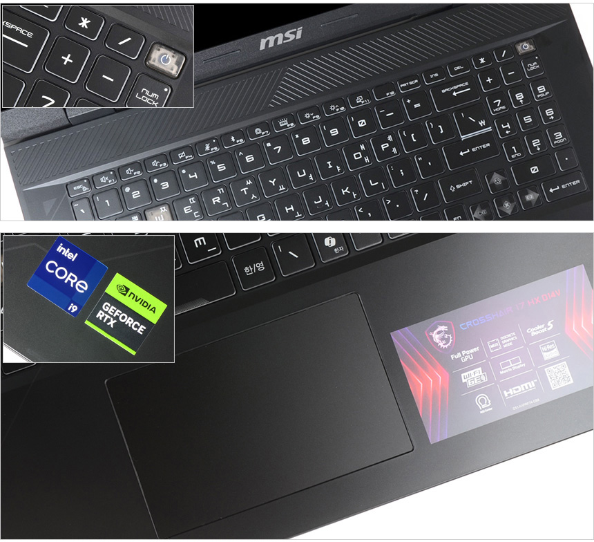 키보드 1열에는 마이크 비활성화, MSI 센터, 화면 및 키보드 조명밝기 등을 손쉽게 설정 할 수 있도록 핫키를 지원하며 우측 상단는 전원 버튼이 설치된 것을 확인할 수 있다. 또한 팜래스트 중앙에는 터치패드가 설치되어 마우스 사용이 힘든 외부에서도 손쉽게 노트북을 조작할 수 있다.
