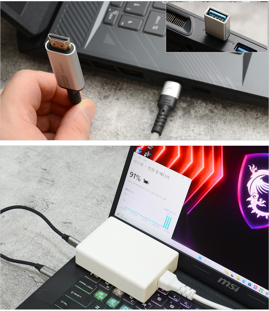 C타입 단자는 디스플레이 출력을 지원해 고해상도 모니터를 연결해 사용할 수 있으며 젠더를 장착하면 A타입의 액세서리도 연결할 수 있다. 뿐만 아니라 PD충전도 지원해 전원 어댑터를 가지고 다니기 힘들 경우 작은 PD충전기를 이용해 전원을 공급할 수 있다. @ 고성능 게이밍 노트북이다. 65W 보다는 100W (단일출력) PD 충전기 사용을 권장한다.