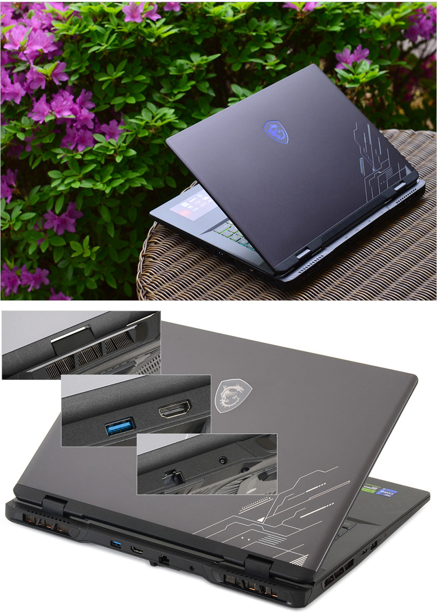 노트북 후면부의 모습으로 양 측면에 통풍구가 설치되어 있고 유선랜 사용을 위한 기가비트 이더넷 단자와 USB 3.2 Gen1 단자가 설치되어 있다. 또한 8K & 4K 고해상도 모니터 연결을 위한 HDMI 2.1 단자와 전원 단자가 설치된 것도 확인할 수 있다.
