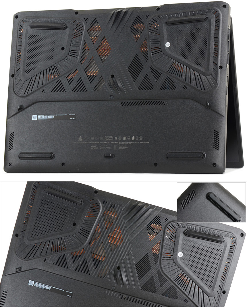 노트북 바닥면의 모습으로 공기가 내부로 원활하게 유입될 수 있도록 팬과 전원부가 설치된 상단에 통풍구를 설치했으며 미끄러짐 방지 및 충격 흡수를 위해 두꺼운 고무 패드를 적용했다. 또한 하단 양 측면에는 2W 스피커가 장착되어 시원한 사운드를 즐길 수 있다.
