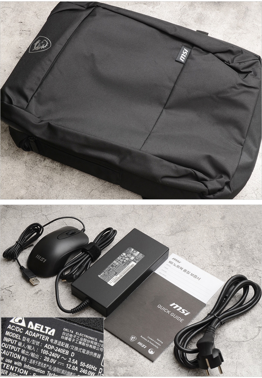 액세서리의 모습으로 240W 전원 어댑터와 전원 케이블, 퀵 매뉴얼, 보증서가 포함되어 있고 게이밍 마우스와 전용 백팩이 제공되는 것을 확인할 수 있다.