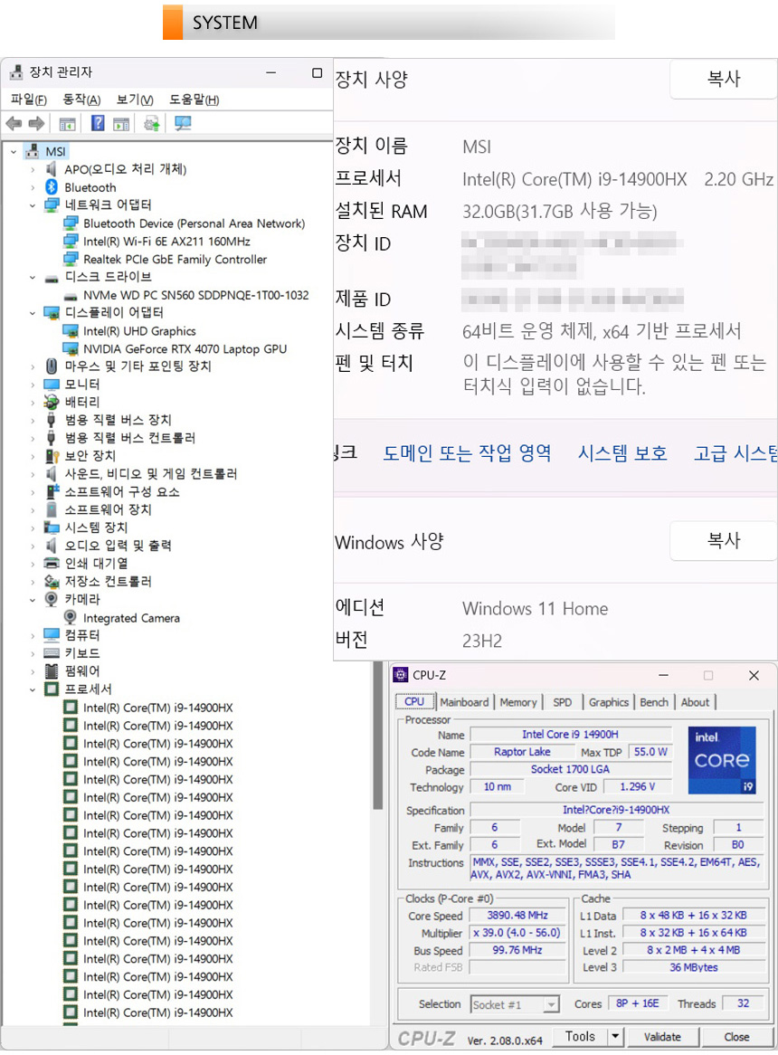 시스템 정보를 확인하고 있는 모습으로 8개의 성능코어에 16개의 효율코어가 더해진 (32 스레드 & 36MB 캐시) 14세대 인텔코어 프로세서 i9-14900HX 프로세서가 장착되어 있고 32GB DDR5 듀얼채널 메모리, 1TB NVMe SSD 등을 지원해 빠른 속도를 즐길 수 있다. 뿐만 아니라 RTX 4070 랩탑 GPU가 장착되어 대부분의 게임을 풀옵션으로 즐길 수 있다.