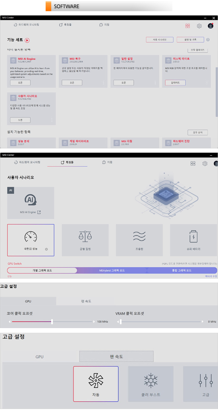MSI 센터의 실행 모습으로 모듈형 방식을 지원해 사용자가 원하는 S/W를 선택해 설치할 수 있다. 유저 시나리오를 통해 퍼포먼스를 설정할 수 있으며 극한의 성능을 선택하면 GPU의 오버클럭이 가능하며 팬속도도 사용자가 원하는 대로 설정할 수 있다. 또한 내장그래픽의 간섭없이 외장그래픽 만으로 게임을 즐길 수 있는 MUX 스위치 기술이 제공되는 것도 눈에 띈다. (긴 배터리 사용시간을 필요로 할 경우 내장그래픽으로 작동하는 통합 그래픽 모드를 선택하기 바란다.)
