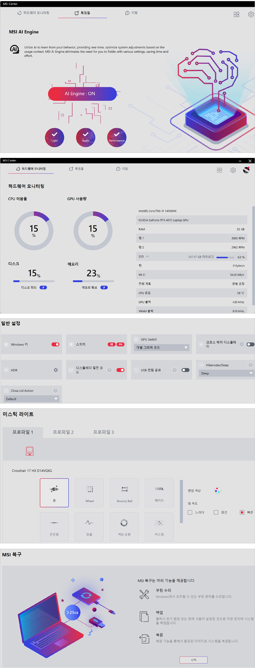 AI에 심혈을 기울이고 있는 인텔의 최신 프로세서 탑재된 노트북 답게 AI 기술이 추가된 것을 확인할 수 있으며 (MSI AI 엔진을 선택하면 노트북의 상태와 용도에 따라 최적의 컨디션을 유지할 수 있도록 자동 조절해 준다.) 노이즈 캔슬링과 미스틱 라이트 (조명), 복구도 지원한다.