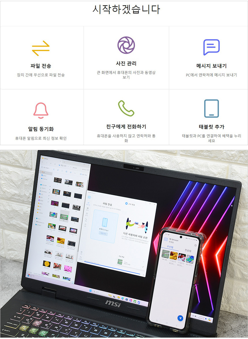 인텔 유니슨을 사용하면 노트북에서 전화를 걸거나 문자 등을 전송할 수 있다. 또한 파일전송 기능을 제공해 사진과 같이 상호간 파일전송이 가능하다. (업무용으로 스마트폰을 사용하고 있다면 유용하게 기능을 활용할 수 있을 것이다.)