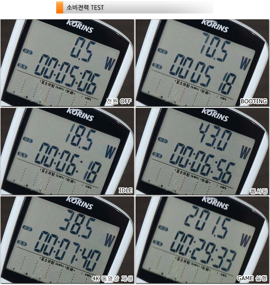 소비전력 테스트를 진행하고 있는 모습으로 (최고성능 모드) 캐주얼한 작업에서는 50W 내외로 작동했다. 또한 게임을 실행하면 최대 200W 까지 소비전력이 상승했으며 대부분의 게임 상황에서 160W~190W 사이로 작동했다.