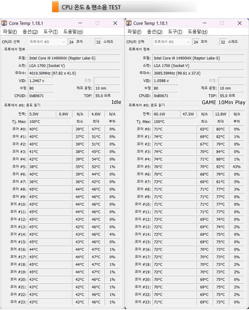 CPU 온도 테스트를 진행하고 있는 모습으로 (실내온도 23도) 아무것도 하지 않는 Idle 상태에서는 40도 초반으로 작동했으며 10분간 게임을 실행했을 때 70~80도 사이에서 온도가 변화하는 것을 확인할 수 있었다. (순간적으로 90도로 올라가곤 했지만 대부분의 상황에서 85도를 넘지 않았다.)