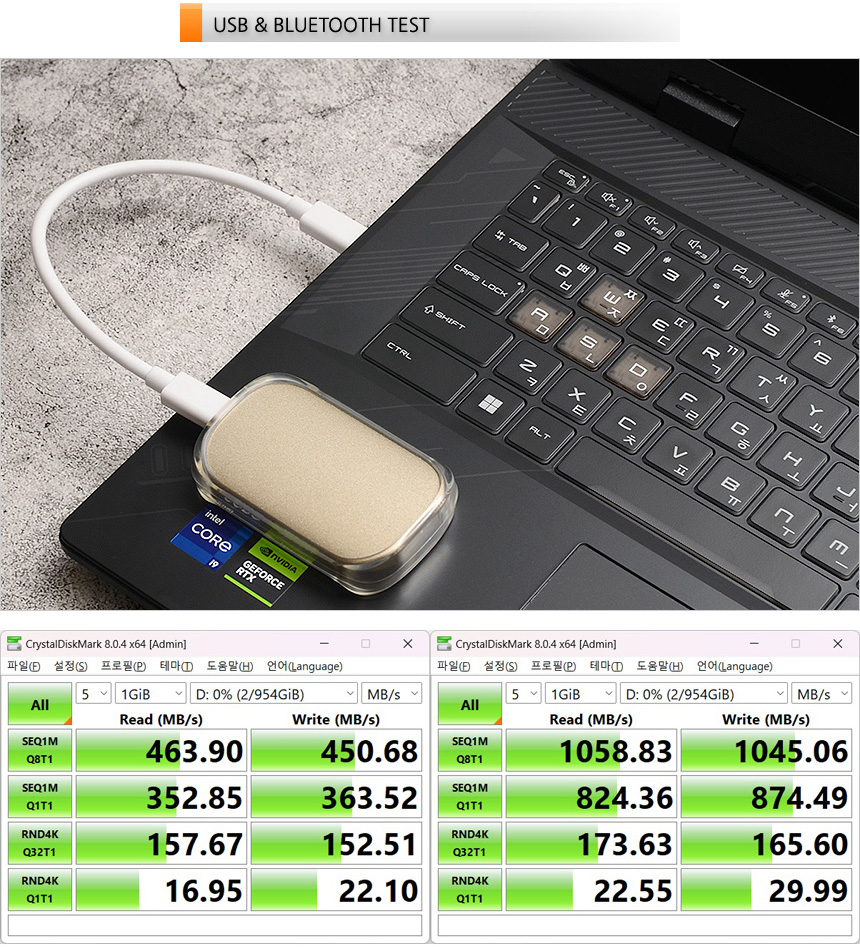 C타입 단자가 USB 3.2 Gen2 인터페이스를 지원해 빠른 데이터 전송이 가능하다. 상단의 사진은 외장 SSD를 이용해 USB 3.2 Gen1 단자와 비교한 모습으로 속도차가 큰 것을 확인할 수 있었다.