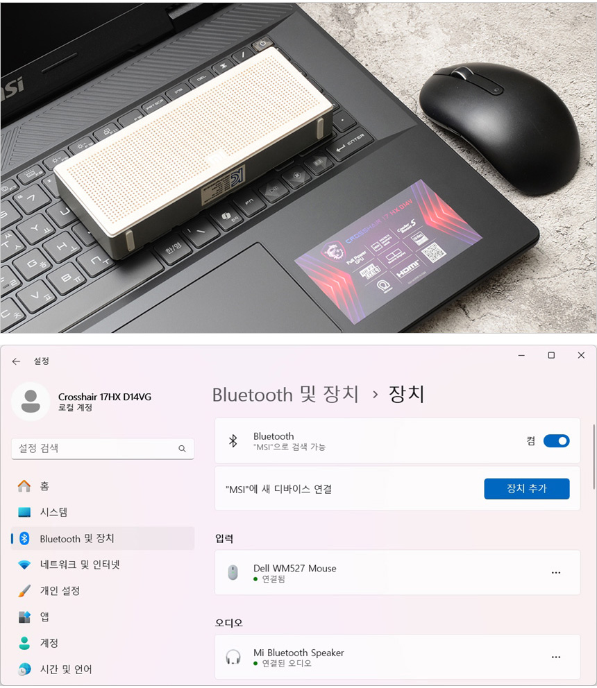 블루투스를 지원해 다양한 액세서리를 무선으로 연결할 수 있다. 상단의 사진은 스피커와 마우스의 연결 모습으로 원활하게 페어링 되는 것을 확인할 수 있었으며 완벽하게 작동했다.