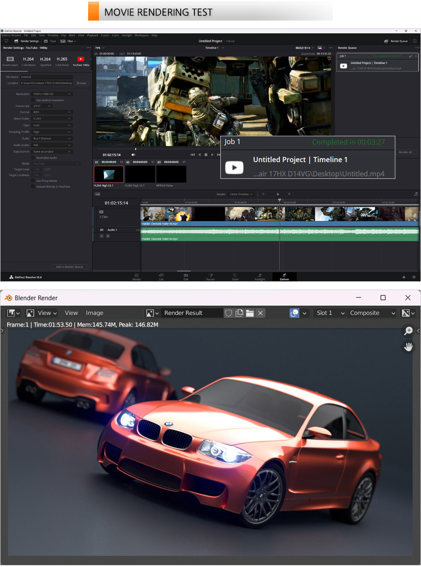 영상편집 S/W 다빈치 리졸브를 이용해 랜더링 테스트를 진행하고 있는 모습으로 (640MB, 920MB, 990MB 4K 동영상을 단일 동영상으로 랜더링, FHD 해상도에 H.264 비디오 코덱) 3분 27초가 소요되는 것을 확인할 수 있었다. 또한 블랜더 랜더링 테스트 에서는 1분 53초가 소요되었다. @ 최상급의 CPU를 사용한 모델답게 보급형 게이밍 노트북과는 확연한 차이를 보여주었다. 대용량 메모리 까지 제공되는 노트북으로 영상편집은 물론 캐드나 3D 등의 용도로도 편하게 사용할 수 있다.