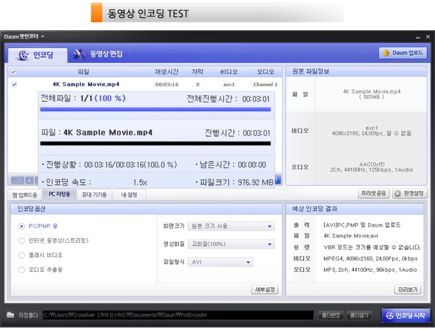 다음 팟인코더를 이용해 4K 동영상의 인코딩 테스트를 진행하고 있는 모습으로 3분 01초의 짧은 인코딩 시간을 보여주었다. (일반 게이밍 노트북 대비 20초 이상 짧은 인코딩 시간을 보여주었다.)
