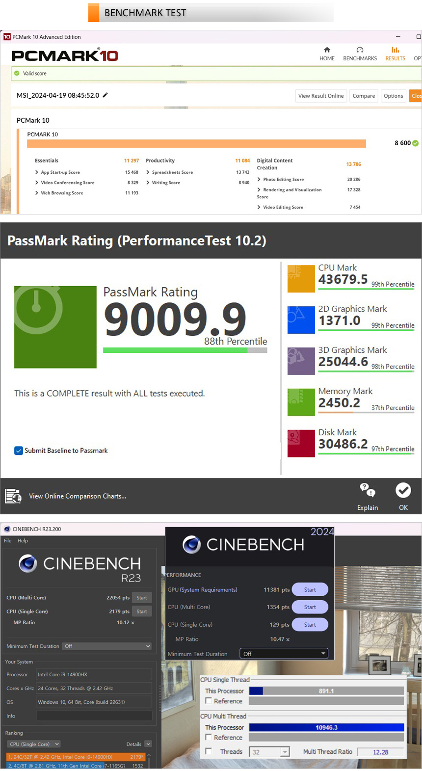 벤치마크 프로그램을 이용해 성능 테스트를 진행하고 있는 모습으로 보급형 게이밍 노트북을 압도하는 높은 스코어를 보여주었다. 게이밍은 물론 전문가용 S/W를 구동하는 용도로도 충분히 활용할 수 있을 것이다.