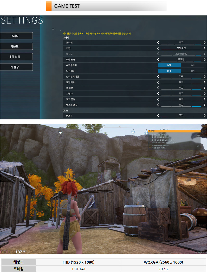 글로벌에서 큰 인기를 끌고 있는 팰월드를 최고 옵션에서 플레이 하고 있는 모습으로 FHD 에서는 100 프레임을 훌쩍 넘겼으며 WQXGA 에서도 프레임이 상당히 높아 부드럽게 실행할 수 있었다. 특히 DLSS를 활성화 하면 (성능 중시) WQXGA 기준 114-142 까지 프레임이 높아져 더 부드럽게 게임을 즐길 수 있다.