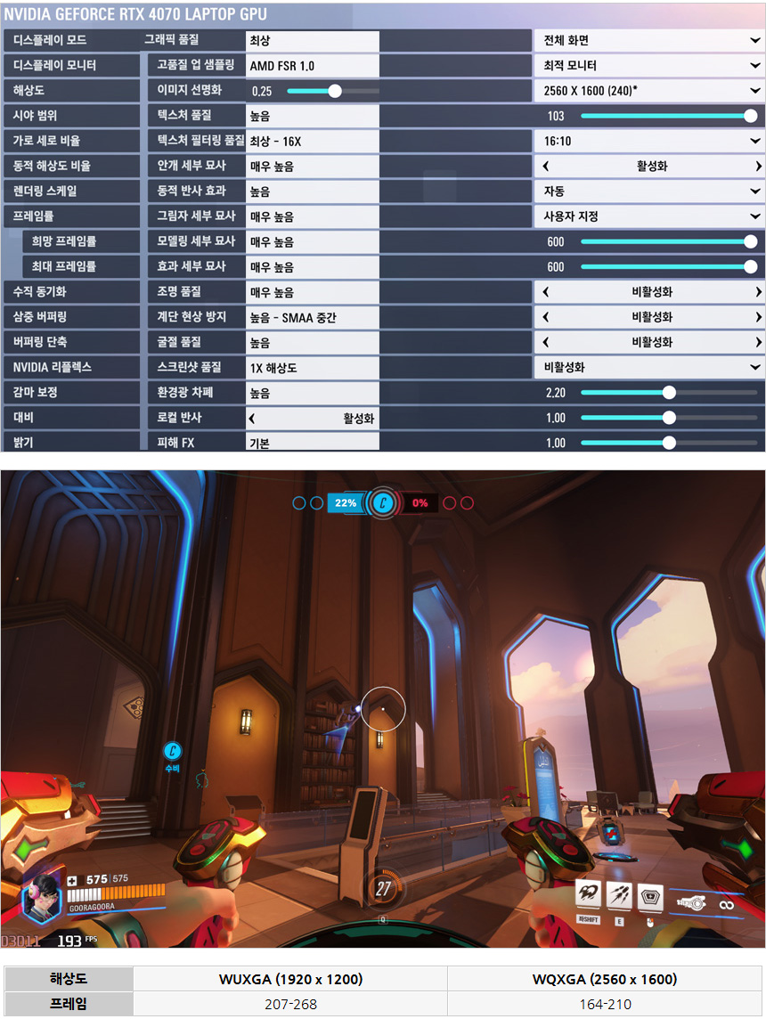 오버워치2를 이용해 게임 테스트를 진행하고 있는 모습으로 최상 옵션을 설정했을 때 200프레임 이상으로 작동해 (WUXGA 기준) 부드럽게 게임을 즐길 수 있었다. 240Hz 주사율을 원활하게 사용할 수 있을 것이다.