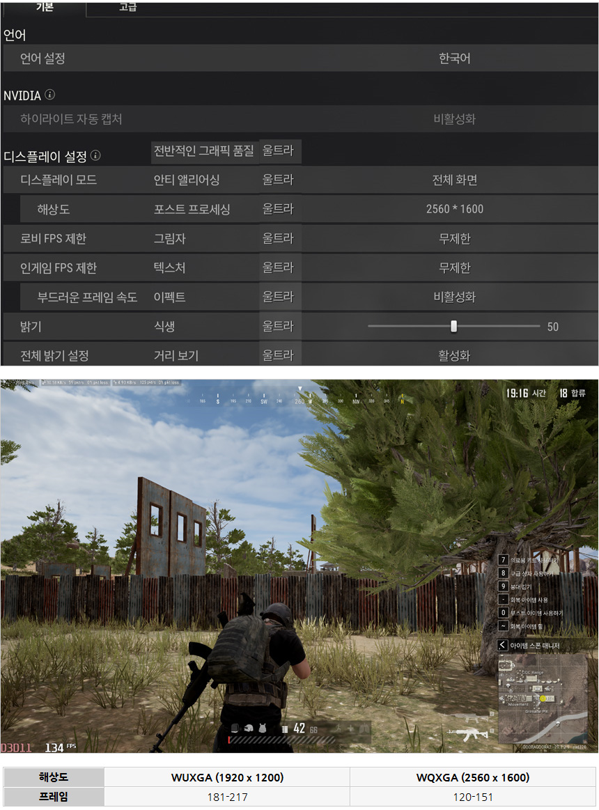 배틀그라운드를 플레이 하고 있는 모습으로 울트라 옵션 설정시 WUXGA에서 200프레임에 근접하는 높은 성능을 보여주었다. WQXGA 해상도에서는 옵션을 낮추면 100 중후반까지 프레임을 끌어 올릴 수 있다.