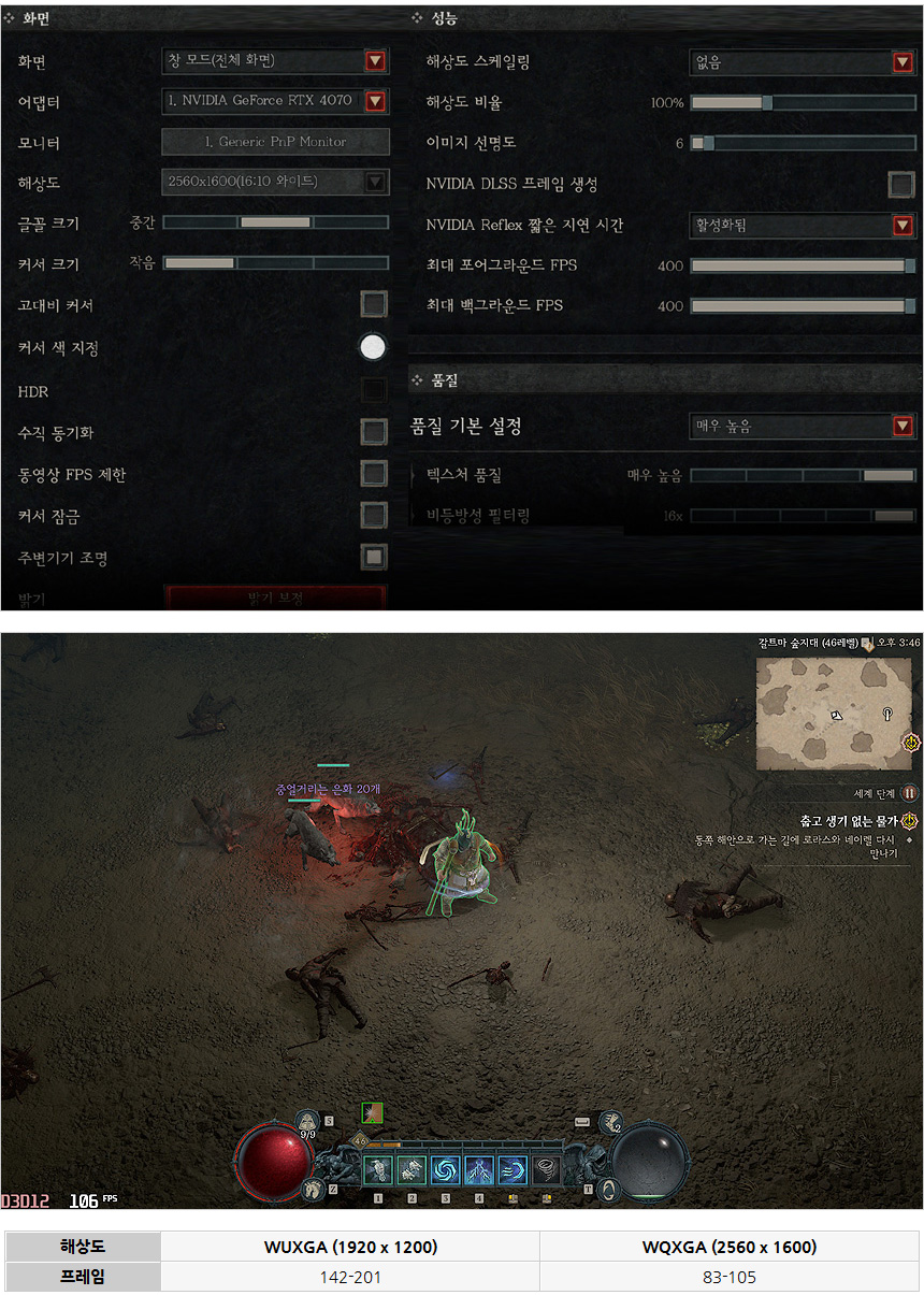디아블로 4를 매우 높음 옵션으로 설정하고 플레이 하고 있는 모습으로 WUXGA 에서는 200프레임에 육박하는 높은 성능을 보여 주었으며 WQXGA 에서는 일부 맵에서 100 프레임을 넘겨 부드럽게 게임을 즐길 수 있었다. 팰월드와 같이 DLSS를 활성화 하면 훨씬 높은 프레임으로 게임을 즐길 수 있다. @ 맵에 따라 프레임이 달라질 수 있는점 알아두기 바란다.