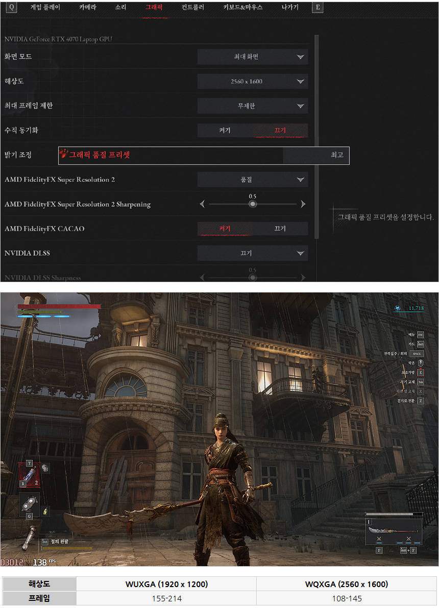 P의 거짓을 최고 옵션에서 플레이 하고 있는 모습으로 WQXGA 에서도 100프레임을 넘겨 부드럽게 게임을 즐길 수 있었다. (다른 최신 게임들과 마찬가지로 DLSS를 통해 프레임을 높일 수 있다.)
