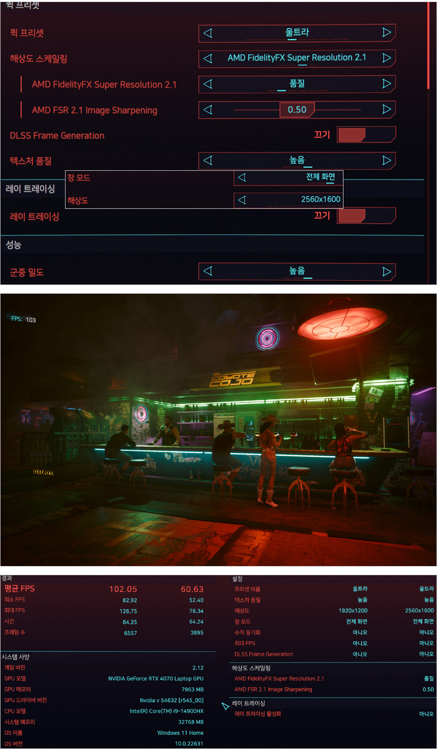 사이버펑크 2077 벤치마크를 울트라 옵션에서 실행한 모습으로 WQXGA 해상도 에서 60프레임을 보여주었다. (구형 보급형 게이밍 노트북은 FHD 해상도에서도 30프레임을 살짝 넘기는 수준이다.) 여유롭게 게임을 플레이 할 수 있을 것이다.
