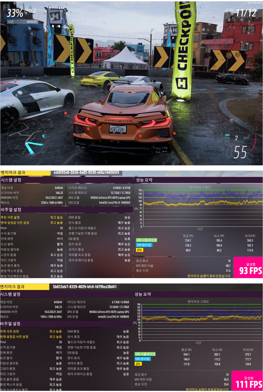 포르자 호라이즌5 벤치마크를 실행한 모습으로 최고 높음 옵션에서 100 FPS에 육박하는 높은 성능을 보여주었다. 해상도나 옵션걱정 없이 부드럽게 게임을 즐길 수 있을 것이다.