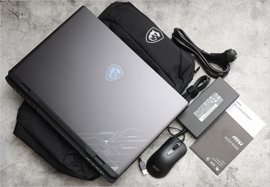 풀KIT 의 모습으로 노트북을 비롯해 240W 전원 어댑터와 전원 케이블을 제공하며 퀵 매뉴얼과 보증서가 포함된 것을 확인할 수 있다. 또한 편하게 휴대할 수 있도록 전용 백팩을 제공하며 게이밍 마우스도 지원한다.