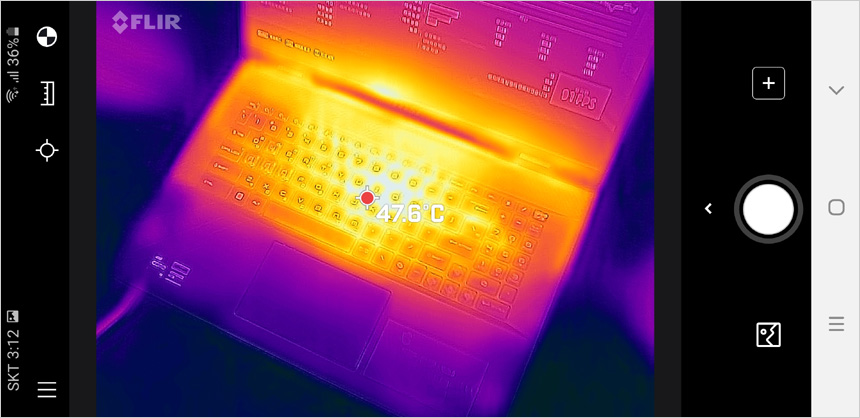 열화상 카메라를 이용해 게임 실행시 노트북의 열분포를 확인하고 있는 모습으로 CPU와 GPU가 설치된 중앙부를 중심으로 열이 자연스럽게 퍼져나가며 측면과 후면의 통풍구를 통해 열이 빠져나가는 것을 확인할 수 있다. (게임이나 작업시 통풍구를 가리지 않도록 주의하기 바란다.) 팜래스트 온도는 낮아 열로 인한 스트레스 없이 손을 올려두고 노트북을 사용할 수 있다.