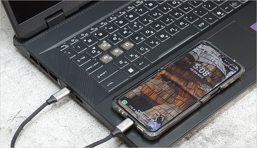 C타입 단자는 상시전원을 지원해 노트북이 꺼진 상태에서도 스마트폰 충전이 가능하다. (단, 전원은 연결되어 있어야 한다.)