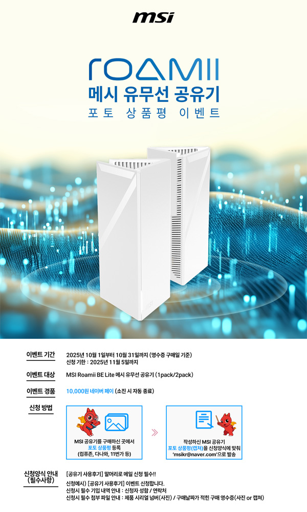 MSI는 MSI의 Roamii BE Lite WiFi7 메시 유무선 공유기 제품을 구매하고 사용 후기를 작성한 고객을 대상으로 네이버페이 1만원을 증정하는 이벤트를 진행한다고 밝혔다.