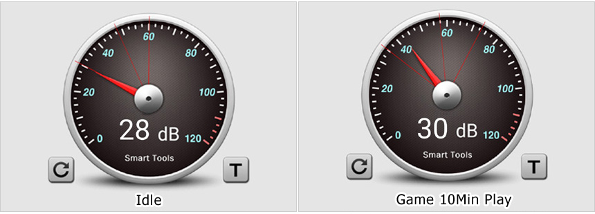 팬소음 테스트를 진행한 모습으로 아이들 상태나 게임일 실행했을 때 모두 팬소음이 들리지 않았다. 이런 이유로 측정기를 후면에 가져다 대고 측정했는데 데시벨이 약간 올라가는 것을 확인할 수 있었다. (조용한 PC가 필요하다면 좋은 대안이 될 것이다.)