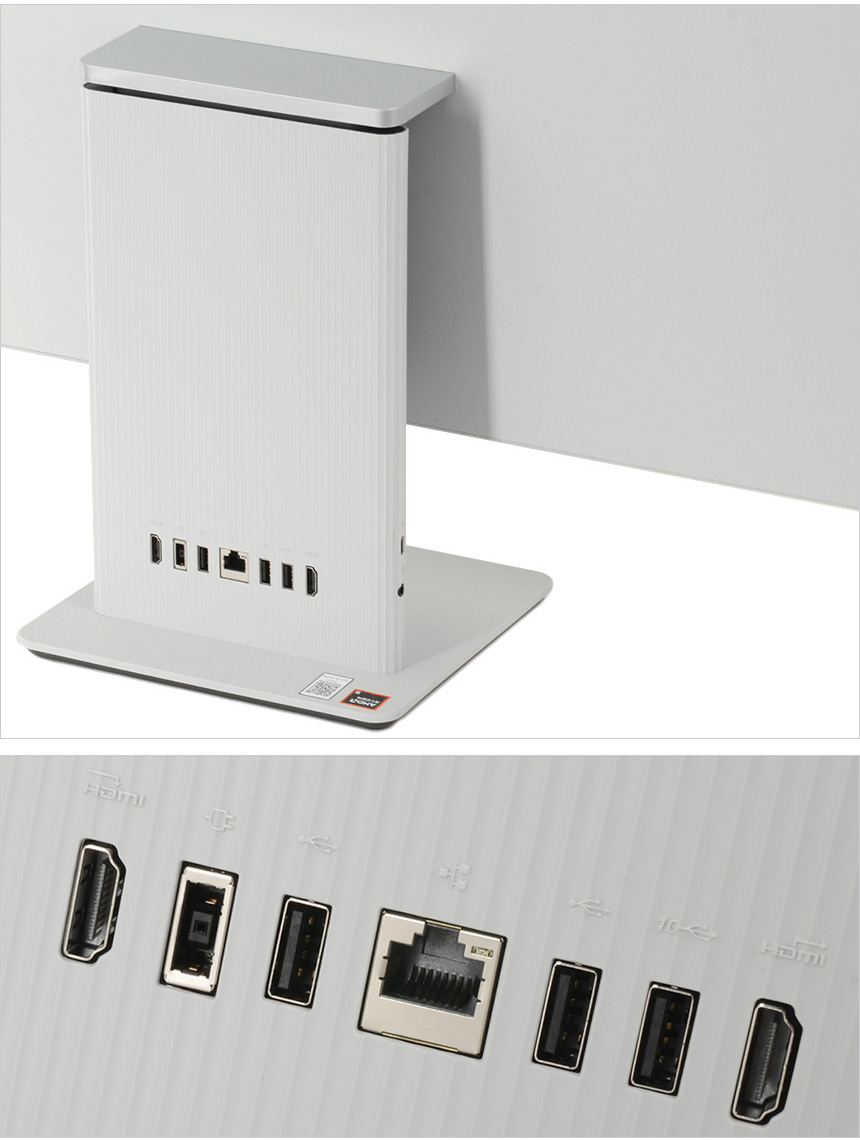PC 후면부의 모습으로 모니터 연결을 위한 HDMI Out 단자를 비롯해 노트북이나 미니PC 등을 연결해 모니터로 활용할 수 있도록 HDMI In 단자를 지원하며 USB 3.2 Gen2 단자를 제공해 고속 데이터 전송이 가능하다. 또한 2개의 USB 2.0 단자를 제공해 주변기기를 편하게 연결할 수 있으며 전원 단자와 유선랜 사용을 위한 이더넷 단자도 제공된다.