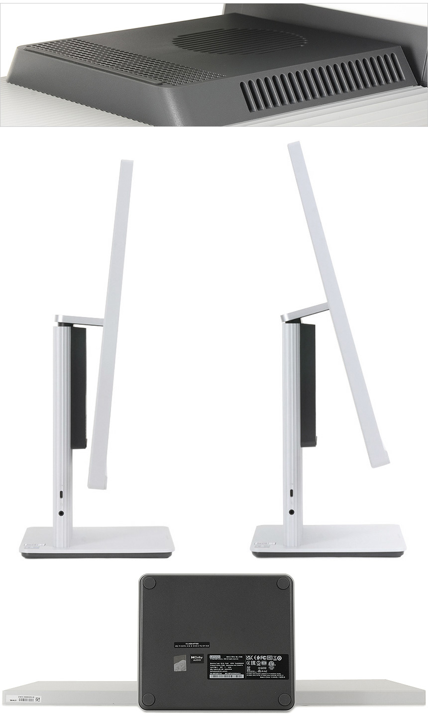 하단부의 모습으로 받침대의 공간이 넉넉해 PC를 사용하지 않을 경우 사진과 같이 키보드와 마우스를 올려두어 책상을 더 깔끔하게 관리할 수 있으며 스마트폰이나 주변기기를 놓아두는 공간으로 활용할 수 있다. 또한 받침대에 부착된 QR코드를 스마트폰으로 스캔하면 생산일자 확인이 가능하며 드라이버 등을 다운로드 받을 수 있다.