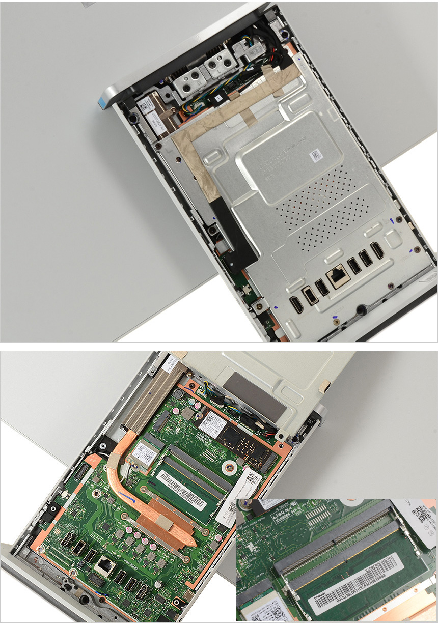 PC 내부의 모습으로 CPU의 열을 식혀주기 위해 히트싱크와 히트파이프가 설치된 것이 눈에 띄며 512GB PCIe 4.0 NVMe SSD가 장착된 것을 확인할 수 있다. (열이 많은 SSD 특성을 감안해 써멀패드가 부착되어 있다.) 또한 2개의 메모리 슬롯을 제공해 용량을 편하게 늘릴 수 있으며 (16GB DDR5 메모리가 장착되어 있다.) Wi-Fi 6 무선랜카드가 장착되어 무선랜과 블루투스 사용이 가능하다.