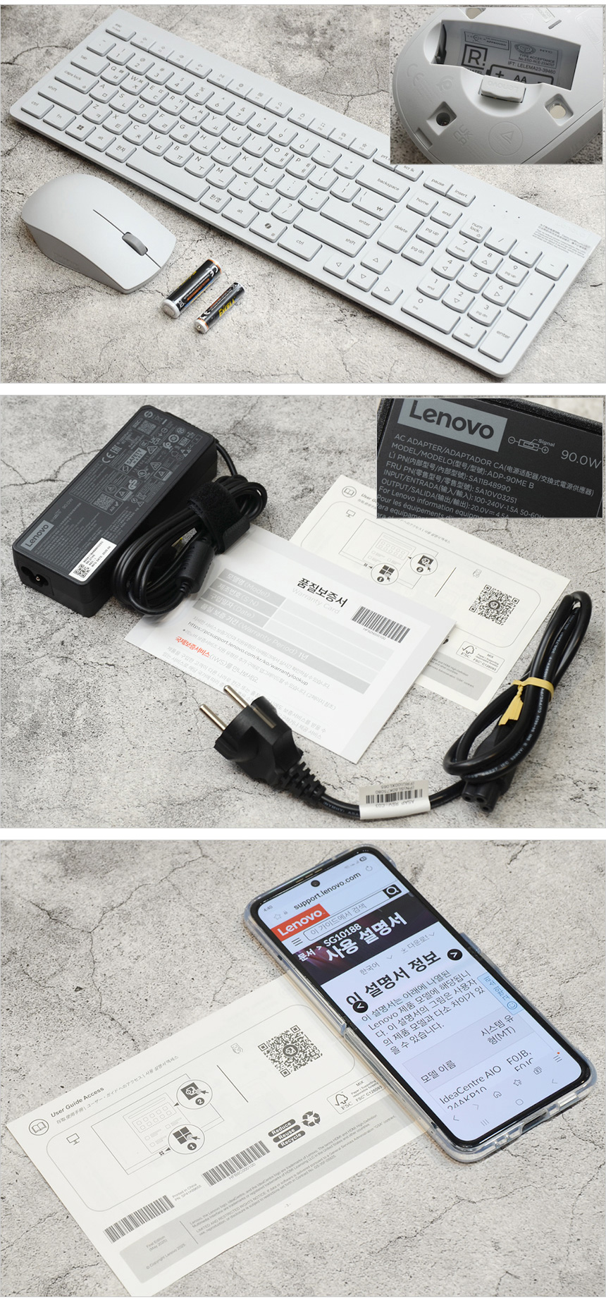 액세서리의 모습으로 90W 전원 어댑터와 전원 케이블을 비롯해 퀵 매뉴얼과 보증서를 제공하며 무선마우스와 키보드 (수신기와 배터리 포함)를 지원한다. (퀵 매뉴얼에 있는 QR코드를 스캔하면 사용설명서를 볼 수 있다.)