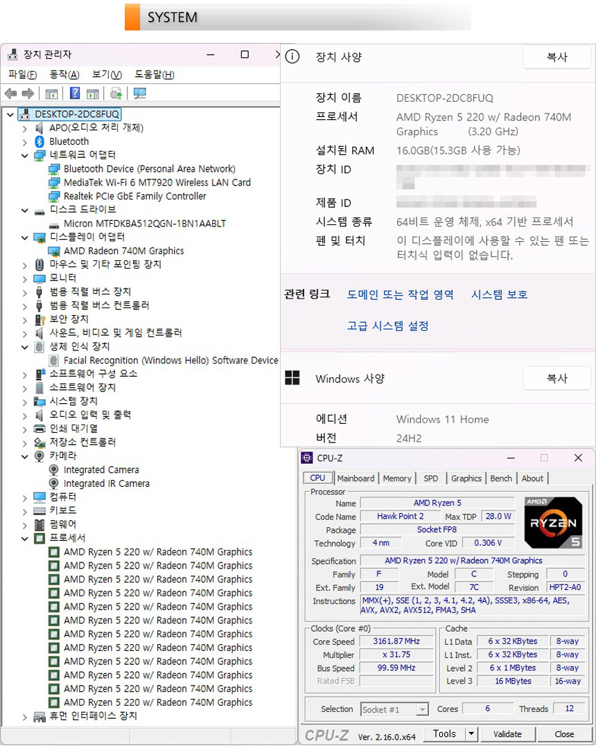 시스템 정보를 확인하고 있는 모습으로 6코어 12스레드에 16MB L3캐시를 지원하는 AMD 라이젠 5 220 프로세서가 장착된 것을 확인할 수 있으며 라데온 740M 내장그래픽과 512GB SSD, 16GB DDR5 메모리가 장착되어 있는 것을 알 수 있다. 또한 기가비트 유선랜과 Wi-Fi 6 무선랜을 지원하며 얼굴인식이 가능한 IR웹캠이 설치된 것도 확인할 수 있다.