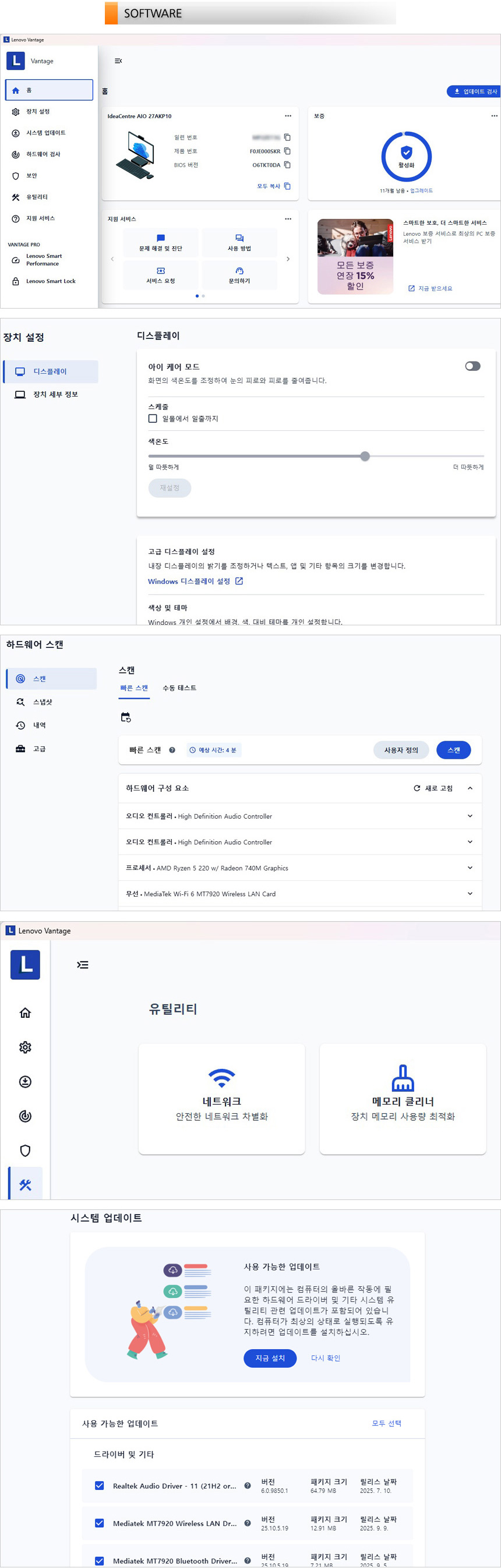 레노버 벤티지를 지원해 PC를 사용자에 맞게 셋팅할 수 있다. 메인화면에서 보증기간 확인이 가능하며 시스템 업데이트를 지원해 최상의 컨디션으로 PC를 사용할 수 있다. 뿐만 아니라 제품 검사와 보안 설정도 가능하고 아이케어 모드 적용으로 청색광으로 인한 눈의 피로와 시력저하를 방지할 수 있다. (PC 구입후 가장 먼저 시스템 업데이트를 실행하기 바란다. 바이오스 업데이트도 지원해 더 쾌적하게 PC를 사용할 수 있다.)