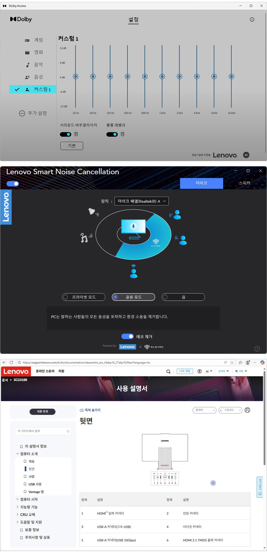 돌비 앱을 통해 EQ설정이 가능하며 효율적인 화상회의를 위해 노이즈캔슬링 앱과 AI 기반 카메라 솔루션 레노버 스마트 미팅을 지원한다. 또한 매뉴얼을 지원해 제품을 사용법 등을 쉽게 확인할 수 있다.