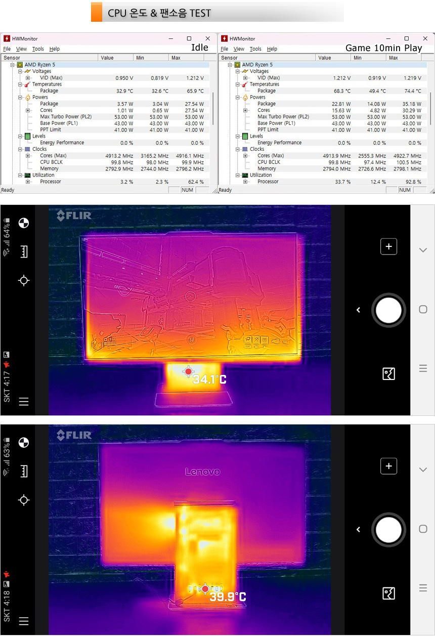 CPU 온도 테스트를 진행하고 있는 모습으로 (실내온도 25도) 아무것도 하지 않은 Idle 상태에서는 30도 중반으로 동작했으며 10분간 오버워치2를 플레이 하고 측정했을 때 에는 70도 초반까지 온도가 올라가는 것을 확인할 수 있었다. 또한 열화상 카메라를 이용해 게임 실행중 열분포를 확인해 보았는데 CPU가 설치된 스탠드 중앙부를 중심으로 열이 퍼져나가는 것을 확인할 수 있다. (전반적으로 온도가 상당히 낮다.)