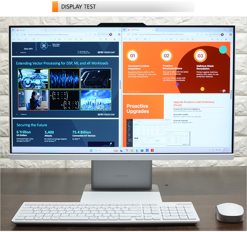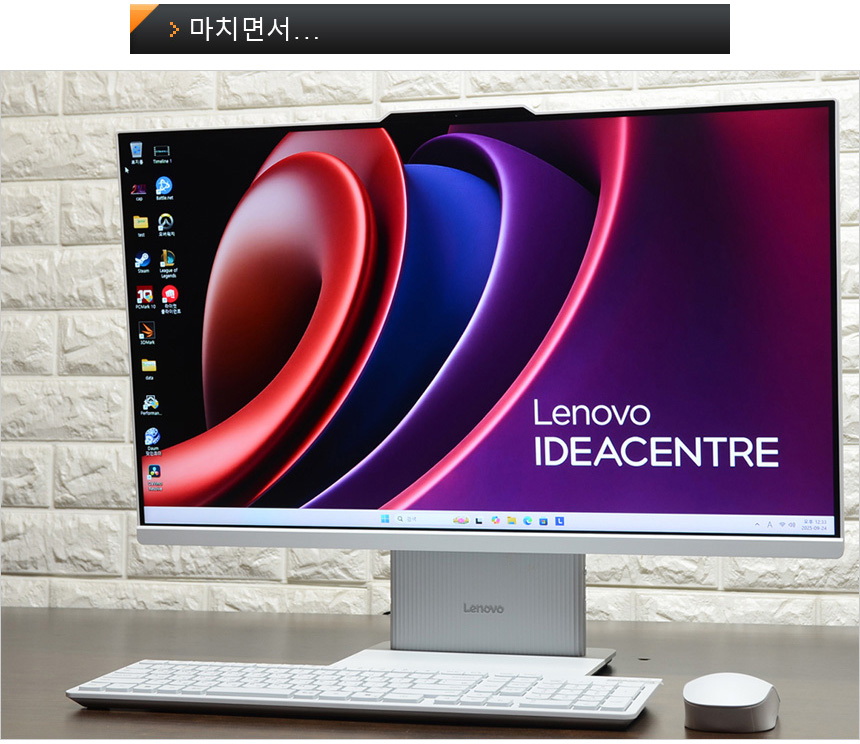 테스트를 위해 책상위에 PC를 설치한 모습으로 27형 대화면을 지원하지만 슬림 베젤로 크기를 최소화 한 모델답게 많은 공간을 차지하지 않았으며 무선 키보드 KIT을 제공해 케이블로 인한 스트레스 없이 PC를 사용할 수 있었다. (전원 케이블은 후면으로 자연스럽게 빼놓을 수 있어 책상을 깔끔하게 관리할 수 있다.) 집이나 사무실, 거실, 매장 등에서 손쉽게 설치해 사용할 수 있을 것이다.