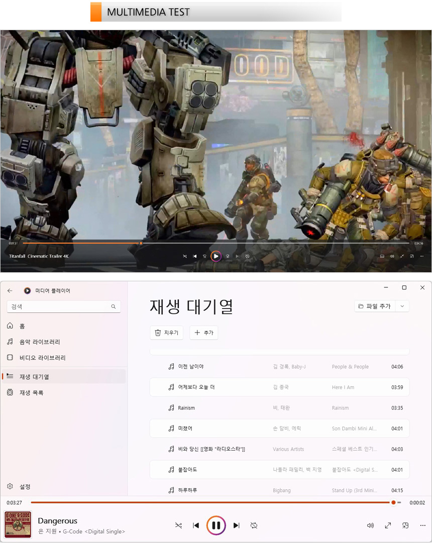 4K 동영상을 이용해 멀티미디어 테스트를 진행하고 있는 모습으로 27형 대화면에 슬림 베젤 적용으로 시원시원한 영상을 즐길수 있었으며 IPS 패널 특유의 선명함이 인상적이었다. 사운드에 특화되어 있을 뿐만 아니라 성능 또한 부족함이 전혀 없는 제품으로 고화질 동영상 감상용으로 만족스럽게 사용할 수 있을 것이다.