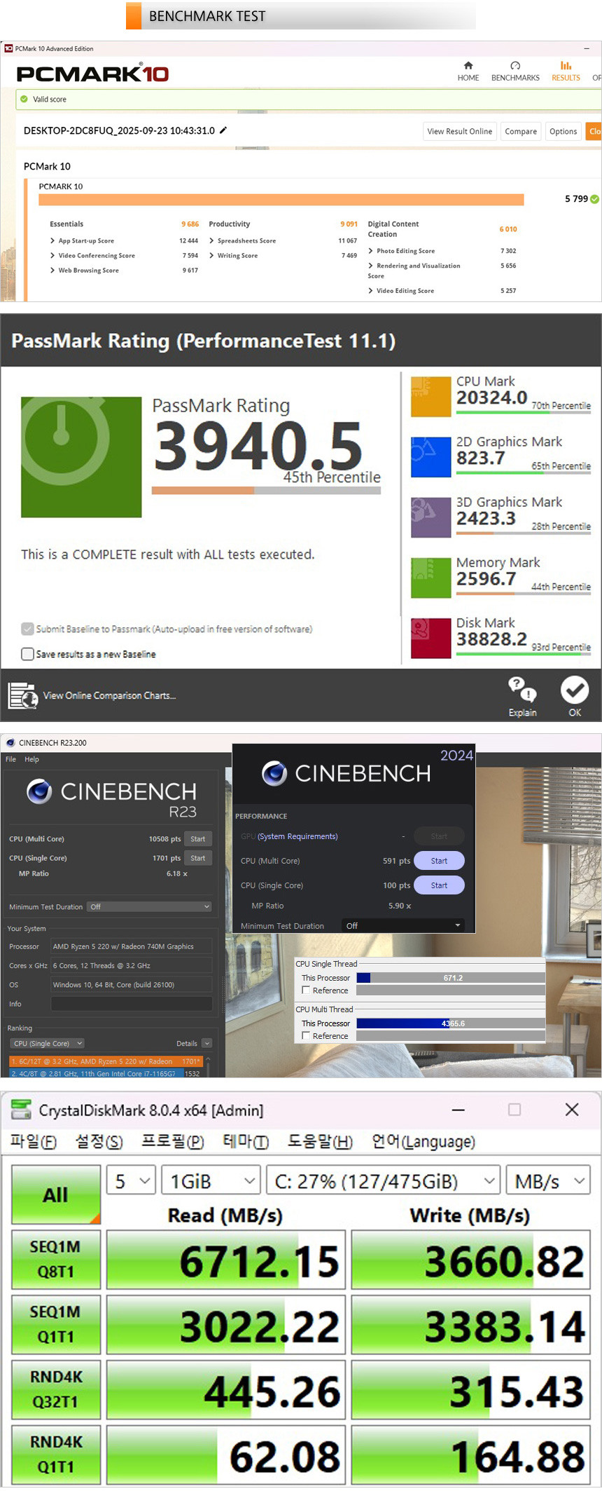 벤치마크 테스트를 통해 기기의 성능을 확인하고 있는 모습으로 고성능 프로세서가 탑재된 모델답게 가성비에 특화된 제품들과는 확연한 스코어 차이를 보여주었다. 캐주얼한 용도는 물론 고성능을 필요로 하는 S/W도 부드럽게 실행할 수 있을 것이다. 또한 저장장치의 속도를 측정한 모습으로 PCIe 4.0 NVMe SSD가 탑재된 모델답게 일반 올인원PC와는 확연히 비교되는 빠른 속도를 보여주었다.
