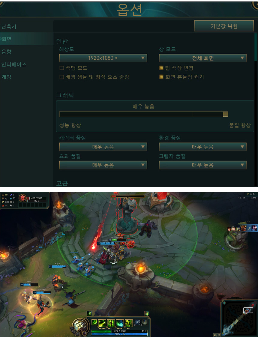 LOL을 실행하고 있는 모습으로 (연습 모드) 매우 높음 옵션에서 71-89 프레임으로 게임을 플레이 할 수 있었다. 멀티게임도 부드럽게 즐길 수 있을 것이다.